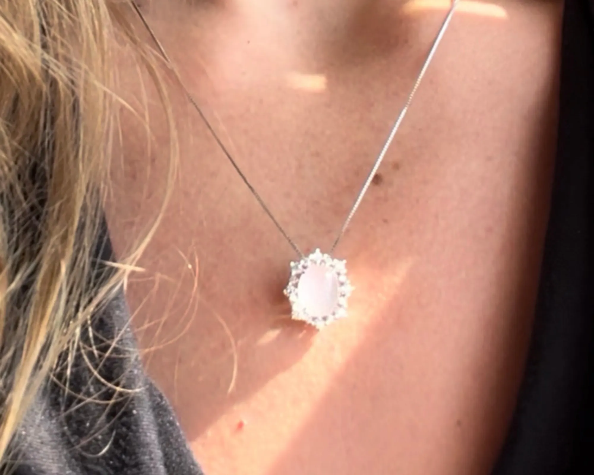 This necklace features a 3.05ct Cabachon cut Rose Quartz surrounded by 0.37ctw of Diamonds. The stones are set into a 14 karat setting on an 18" Box Chain.