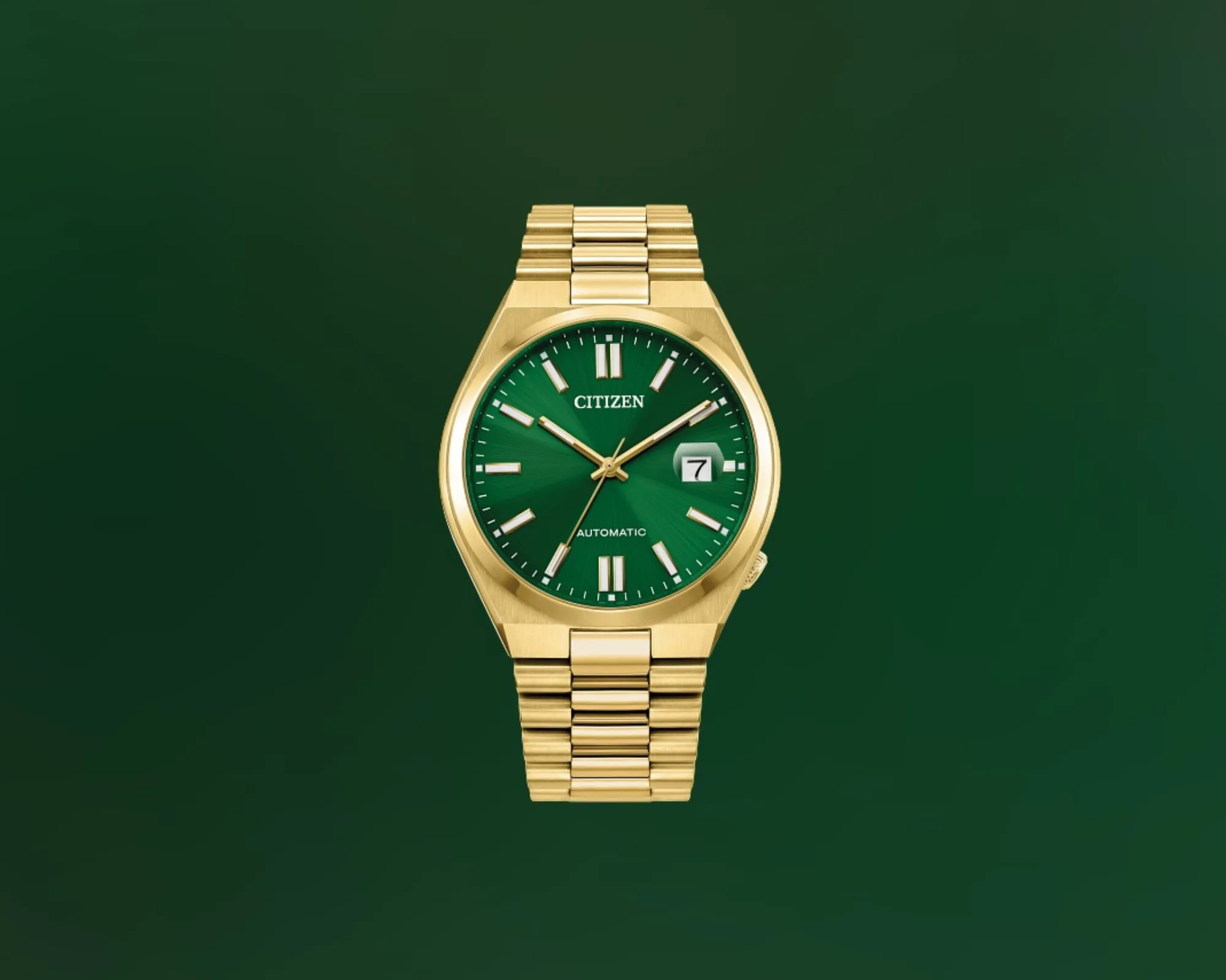 Men's Automatic Stainless Steel Gold-Plated Link-Style Watch with a Green Dial.