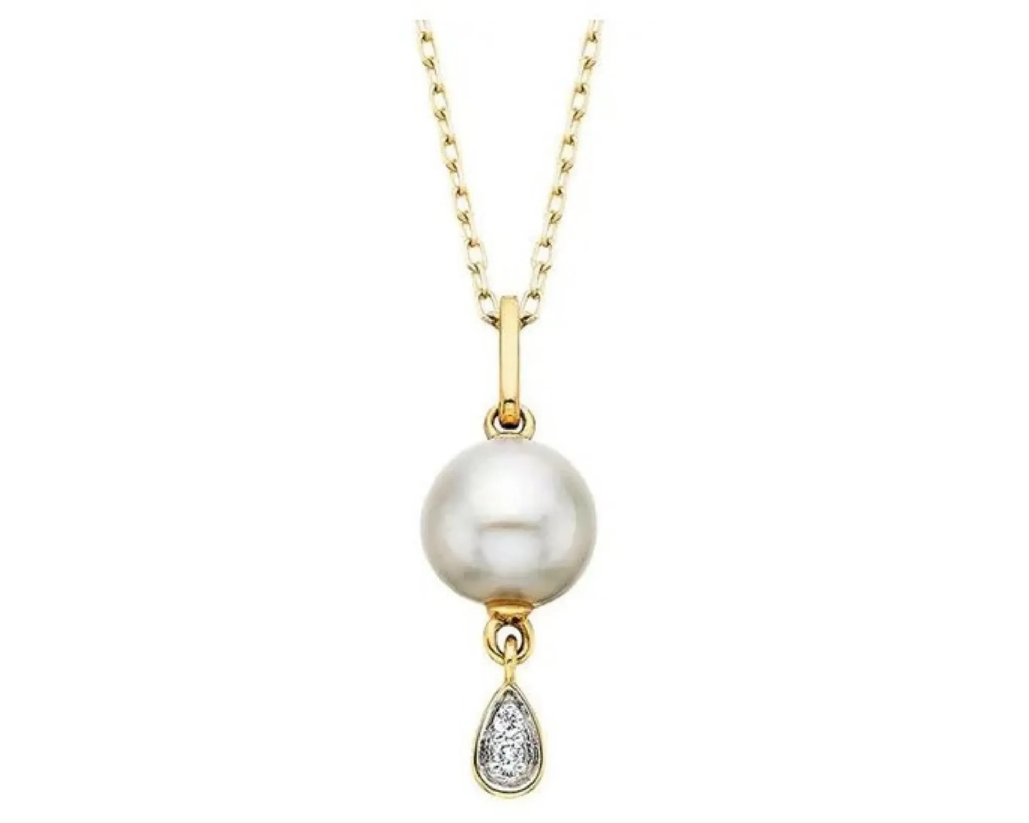 This drop Pearl Necklace features a 0.02 ctw Diamond Drop and a Freshwater Pearl. The stones are set onto a 10 karat yellow gold setting on an 18" Cable Chain.